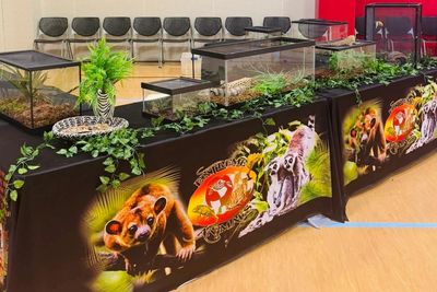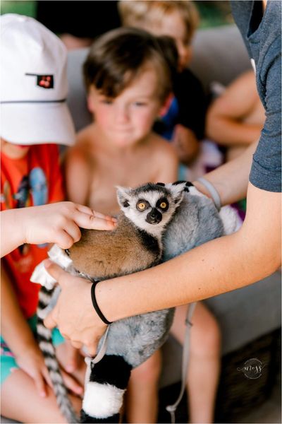 The petting zoo consists of 4 large tables tastefully decorated 'Safari style' with several animals (primarily reptiles) displayed in habitats. Most of these are touchable, a couple are for display only. A separate fenced in area with the tortoises will be available for kids to go in and interact with. Also, the handlers will have larger animals (such as baby kangaroo, kinkajou or lemur, ferret or chinchilla, 3 banded armadillo, large albino python, etc.) for your guests (kids, parents, teachers, etc.) to interact with and take photos with. If needed we can also bring tents for shade. This type of setup would be $1400/2hrs and $500/each additional hr.
